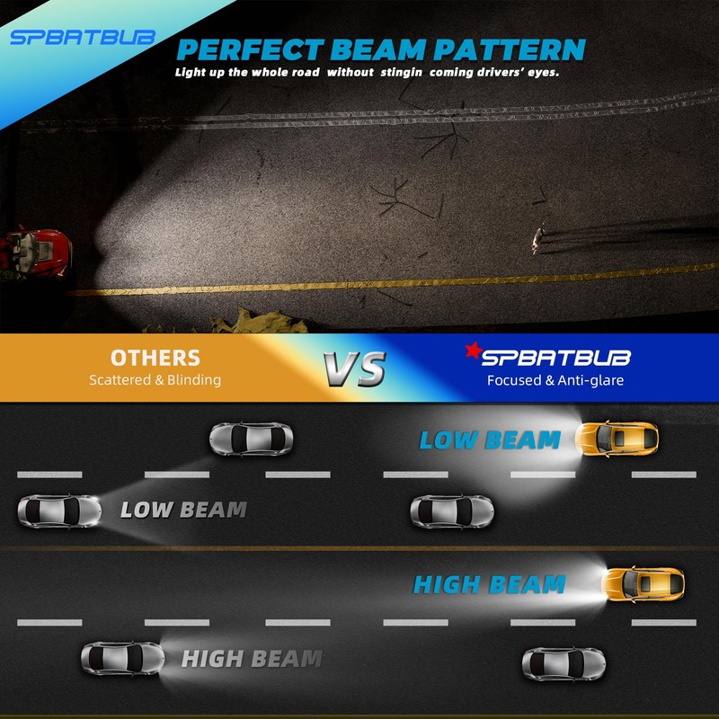 - đă238% Brighter/Power SavingăThese headlight bulbs are three times brighter than the originals, with each bulb at 100W and a crisp 6000K white beam. Equipped with new chips, they pump out up to 1200 lumens per bulb. The beam pattern is spot-on with sharp cut-off linesâno dark spots, no flickering, no flashing. Plus, theyâre 100% more energy-efficient compared to your standard halogen bulbs.
