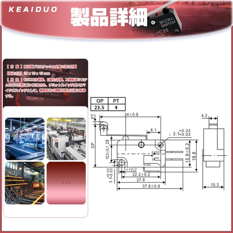 - **3. **Physical Size and Installation Details*** : Overall dimensions: Compact design, dimensions are 28 x 16 x 10 mm, easy to integrate into various narrow spaces. Installation details: Provides precise mounting hole diameter (0.08 inch (2 mm) and hole spacing (0.37 inch (9.5 mm)), ensuring that the installation is firm and easy to align. Lever Arm and Drum Size: Lever arm length is 17.5mm, width is 4mm, diameter of drum is 5mm, thickness is 3mm, specialized in precise control design, and improved operating sensitivity