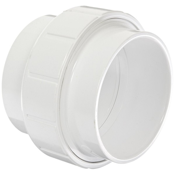 This Spears union pipe fitting with a Buna-N O-ring is made of schedule 40 PVC and has socket end connections. This union fitting has three pieces and includes a threaded connection that can be screwed or unscrewed to connect or disconnect pipes more easily than with a coupling. It has female socket connections for sliding over the ends of unthreaded male pipes or fittings. The socket end connects to pipes with a smooth bore for enhanced flow and has a buna-nitrile (also called Buna-N) O-ring seal. Buna-nitrile has high tensile strength; abrasion, tear, and compression set resistance; and compatibility with a variety of fluids such as petroleum and hydrocarbons. This schedule 40 (standard wall) fitting is made of PVC (polyvinyl chloride) for corrosion resistance, high strength, and less weight than fittings made from metal. It is compatible with schedule 40 PVC pipes and fittings. PVC can be connected to other materials such as steel, copper, or cast iron using transition fittings. This fitting provides superior flow to metal because of its smooth interior finish, which reduces friction and inhibits buildup of materials. It has a maximum operating pressure rating of 150 pounds per square inch (psi) at 73 degrees F. This fitting complies with National Sanitation Foundation International (NSF)/American National Standards Institute (ANSI) 61 Annex G, NSF/ANSI 372, and conforms with lead content requirements for “lead free” plumbing as defined by California, Vermont, Maryland, and Louisiana state laws and the U.S. Safe Drinking Water Act due to take effect January 2014. This union pipe fitting is suitable for use in cold-water pressure distribution systems including irrigation, pool and spa, potable water, and chilled water applications.