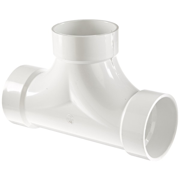 The Spears P448 series DWV two-way cleanout is made of PVC, has hub connections on all ends, connects and branches three pipes and is suitable for waste water systems in residential applications. This fitting is made of PVC (polyvinyl chloride) for use in non-pressure residential drain, waste, vent (DWV) sanitary systems. PVC resists corrosion and chemicals, exhibits high strength, and weighs less than fittings made from metal. PVC can be connected to other materials such as steel, copper, or cast iron using transition fittings. This tee fitting is T-shaped and has three ends to connect and branch three pipes, two on the main run and one branch at a 90-degree angle from the middle of the tee. The branch has a threaded end for a plug which can be opened for cleanout. Internal construction directs the flow in a gradual angle to prevent clogging. Pipe dimensions for tees are represented as A x B x C. “A” and “B” indicate the main run on the fitting, and “C” indicates the branch. The hub connections slide over the ends of male unthreaded pipes with a smooth bore for enhanced flow, and the fitting has an operating temperature range of 73 to 140 degrees F (23 to 60 C). This DWV two-way cleanout tee complies with American Society for Testing and Materials International (ASTM) D2665 and ASTM D3311 for quality assurance, is National Sanitation Foundation International (NSF)/American National Standards Institute (ANSI) Standard 14 certified to the Uniform Plumbing Code (NSF – U.P. Code) and NSF-dwv for quality assurance, and conforms with lead content requirements for "lead free" plumbing as defined by California and Vermont. It is suitable for waste water systems in residential applications.
