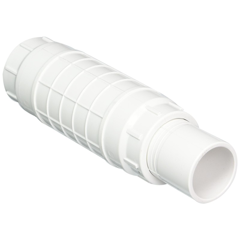 The Spears S118 series white repair coupling is made of PVC, has a spigot end and a socket end, comes with an EPDM O-ring, connects two pipes running in the same direction, and is suitable for waste water systems in residential applications. This schedule 40 (standard wall) fitting is made of PVC (polyvinyl chloride) for corrosion resistance, high strength, and less weight than fittings made from metal. PVC can be connected to other materials such as steel, copper, or cast iron using transition fittings. The EPDM (ethylene propylene diene monomer) O-ring has good resistance to weathering, ozone, UV light, electricity, oils, water, steam, and some solvents. This repair coupling fitting connects two ends of a pipe to repair damage, or it can be used for lateral and riser add-ons or be used to install valves in existing piping systems. The spigot connection fits into the end of a female unthreaded pipe of the same diameter as the fitting, minimizing turbulence and creating a tight seal, and the female socket connection slips over the end of a male unthreaded pipe to create an enhanced flow. The fitting has a maximum operating pressure of 235 pounds per square inch (psi) at 73 degrees F with a temperature range of 73 to 140 degrees F (23 to 60 degrees C). This repair coupling meets American Society for Testing and Materials International (ASTM) D2467 for quality assurance, National Sanitation Foundation International (NSF)/American National Standards Institute (ANSI) Standard 61 Annex G for potable water, and conforms with lead content requirements for "lead free" plumbing as defined by California and Vermont. It is suitable for waste water systems in residential applications.