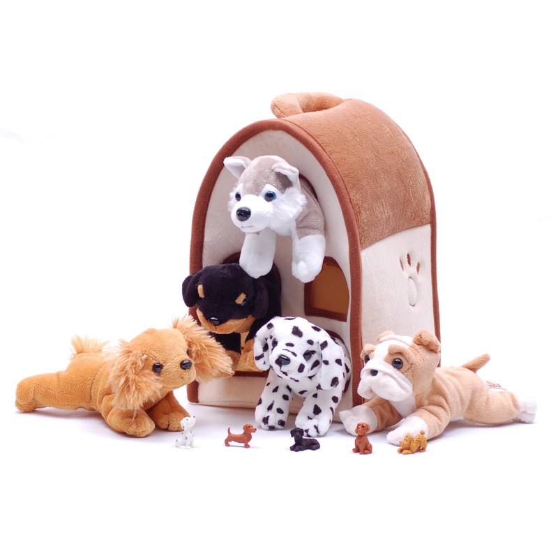 - includes a cute Dog House with handle to store and carry the stuffed dogs