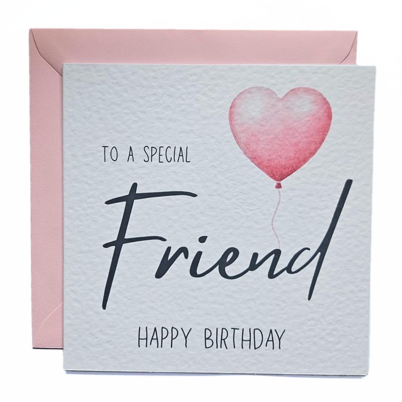 Express your heartfelt birthday wishes to a cherished friend with this elegantly designed greeting card. The clean, minimalist design features a beautifully watercoloured heart balloon in soft pink hues floating gracefully above stylish typography. The message 'To a Special Friend' and 'Happy Birthday' is artfully presented in a modern, hand-lettered style that adds a personal touch. The card is crafted on high-quality white textured cardstock, giving it a premium feel, and comes complete with a matching pink envelope. Perfect for conveying your warm wishes on their special day, this card offers ample space inside for your personal message. The sophisticated design strikes the perfect balance between simplicity and sentiment, making it suitable for any friend, regardless of age or style preference. The card's generous standard size provides plenty of writing space whilst fitting perfectly in the accompanying envelope.