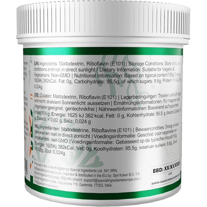 Made with entirely natural ingredients our Easy Glow powder is a fun product which can be added to drinks and foods to make them glow in the dark when exposed to UV light. Use it at parties, Halloween or any special occasion to create food and drinks that glow. Create glow in the dark ice cream, glowing jellies, ice, cakes, purees and sauces. It can also create glow in the dark cocktails, soft drinks and many more. Suitable for Vegans, Vegetarians, Non-GMO, Halal friendly and Kosher friendly. How to use: Dissolve 2g of Easy Glow powder in 1 litre of liquid. Ideally, use a blender, or shake the powder and liquid vigorously inside a container to dissolve. If using in food ideally add Easy Glow to some liquid before or within your recipe. Soluble in both hot and cold. Ingredients: Maltodextrin, Riboflavin (E101). Storage Conditions: Store in dry, cool conditions and not in direct sunlight. Use within 6 months of opening. Dietary Information: Suitable for Vegans & Vegetarians. Non-GMO, Halal friendly, Kosher friendly.