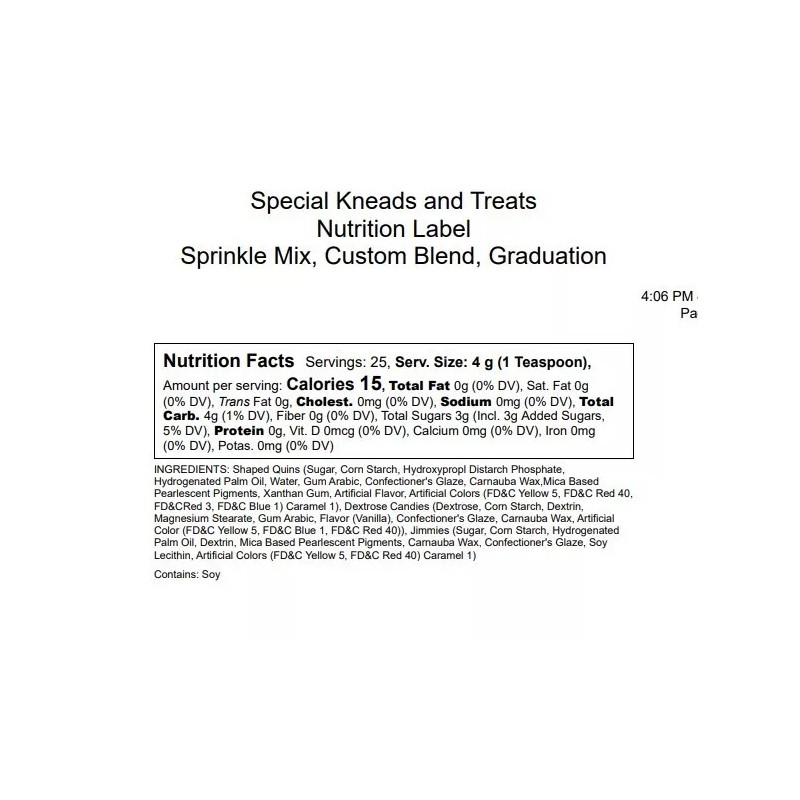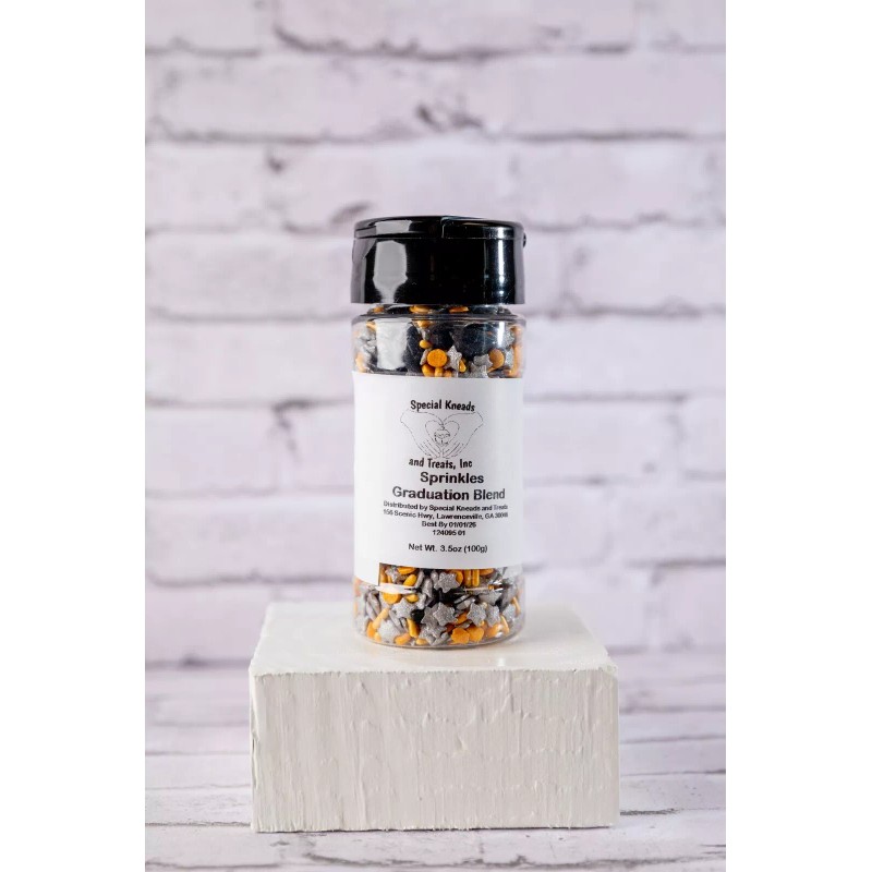 Special Kneads and Treats sprinkles; The Graduation blend! This grand mix of gold jimmies and quins, silver star-shaped quins, and features black dextrose candies graduation caps. Want to add your school colors??? See our other sprinkle listing for a variety of solid color quins, sanding sugar, and jimmies sprinkles available for purchase.