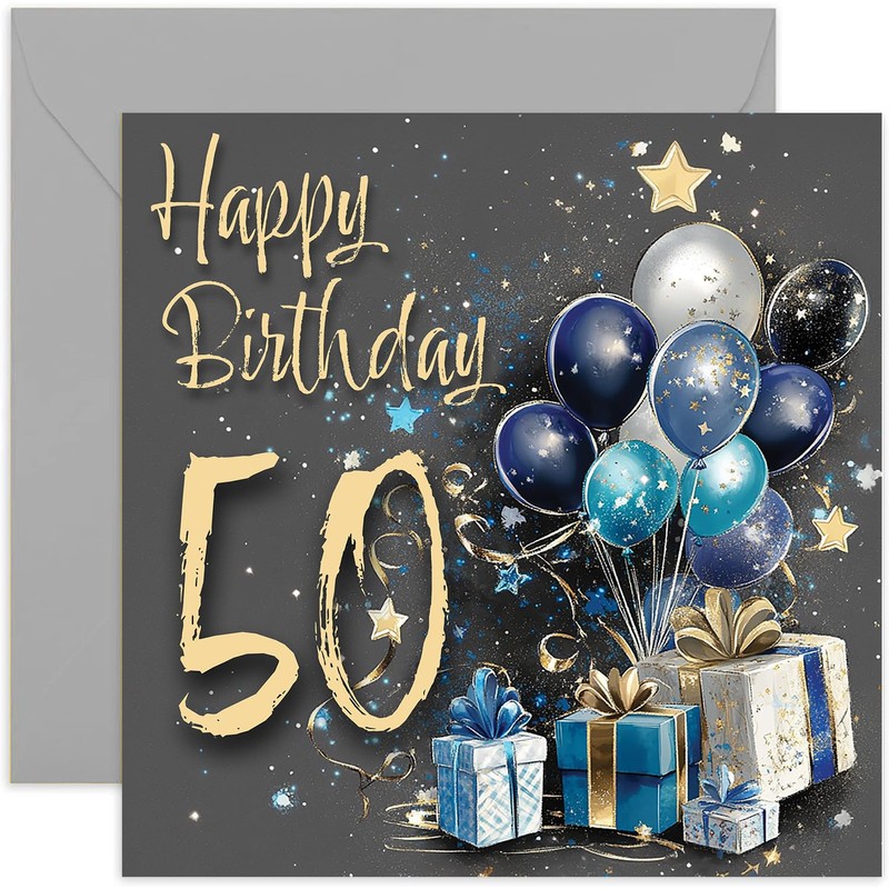 Special Male 50th Birthday Card for Men - Fifty-Five Years Old - Blue and Gold Gifts and Balloons Artwork for Men - Stylish and Traditional Milestone Age Bday Presents - Blank Inside with Envelope