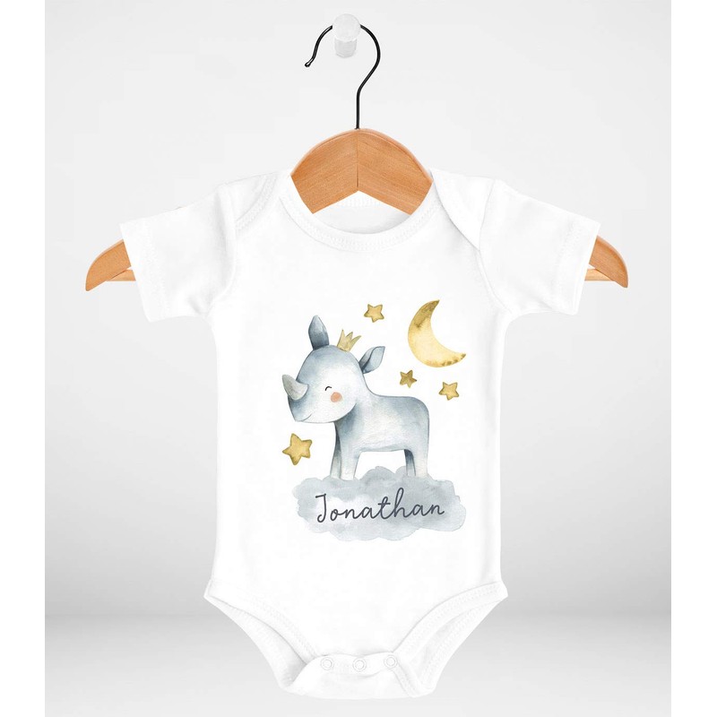 SpecialMe® Baby Bodysuit with Name Print Animal Motifs Rhino Lion Elephant Watercolour Short Sleeve Organic Cotton, Safari Rhino White