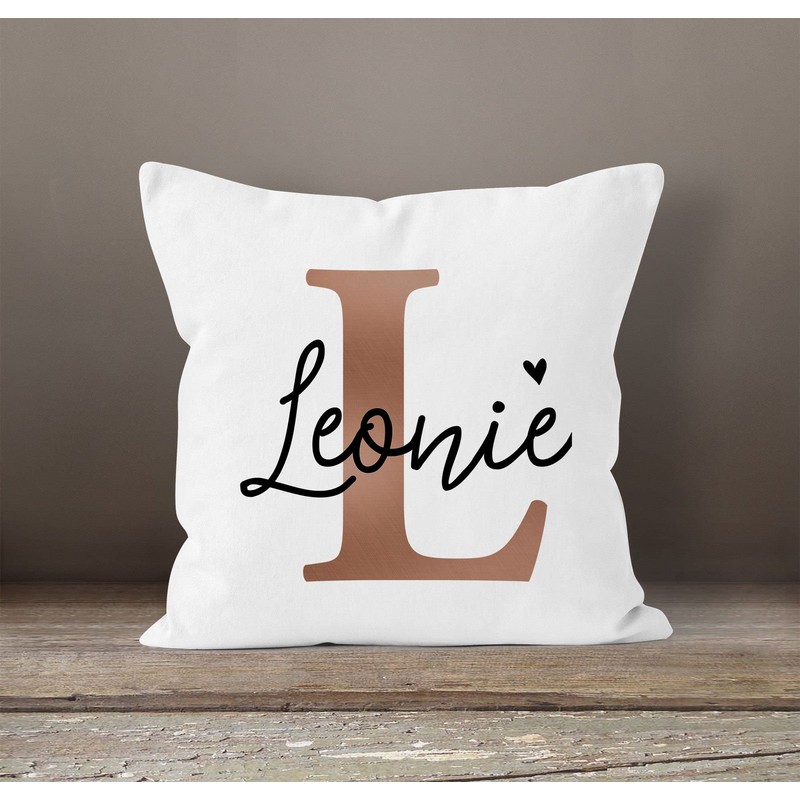 - Beautiful cushion cover with monogram and name. The copper look of the initial letter looks elegant and makes this cushion cover a timeless and elegant decorative accessory and it is also a great individual gift idea for a birthday, name day, etc.