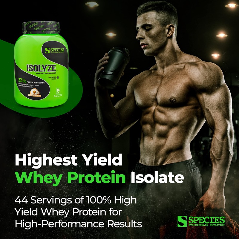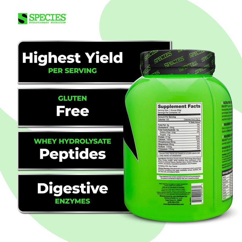 - HIGHEST PROTEIN YIELD ON THE MARKET: Isolyze from Species Nutrition has 28 grams of protein per 33 gram serving size, making it the highest yield whey isolate on the market. By virtue of the advanced filtering techniques, Isolyze is nearly devoid of lactose which makes it extremely well tolerated by even the most lactose sensitive individuals.