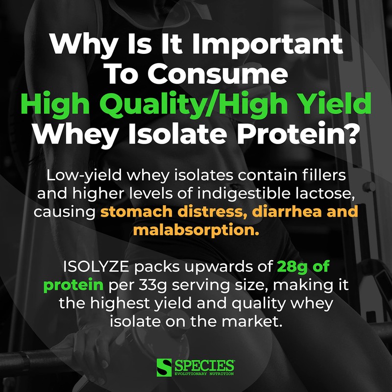 - ULTRA PURE WHEY ISOLATE. Isolyze is a pure whey protein isolate with 28 grams of protein per 33 gram serving size. Great tasting flavors with next level performance for the highest yield on the market. Our protein isolate is microfiltered for maximum efficiency with no added fat or sugar.