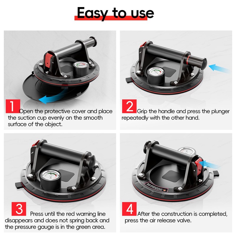 • Easy to Operate: Place the suction cup on a smooth, non-porous surface, hold the handle in place and press the plunger quickly and continuously until the red warning line disappears and the pressure gauge's needle is in the green zone. When handling is complete, simply press the bleeder valve or pull the release tab.PLEASE NOTE:When the red warning line appears during handling, this indicates a loss of vacuum, simply press the piston again without removing the suction cup