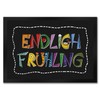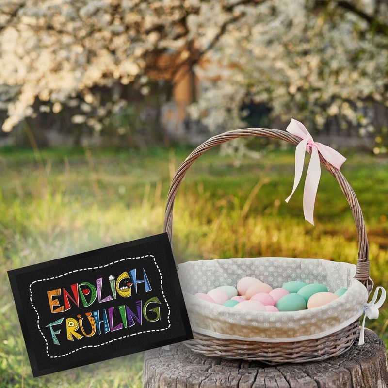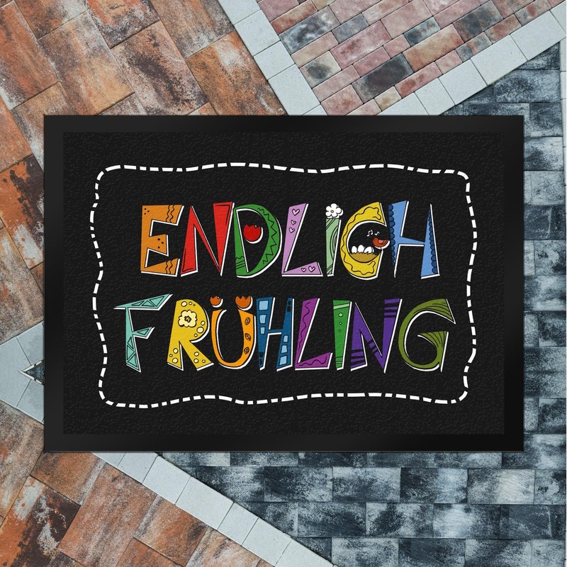 - The doormat carries the saying "Endlich Frühling" in colourful, decorated letters. The background is black.
