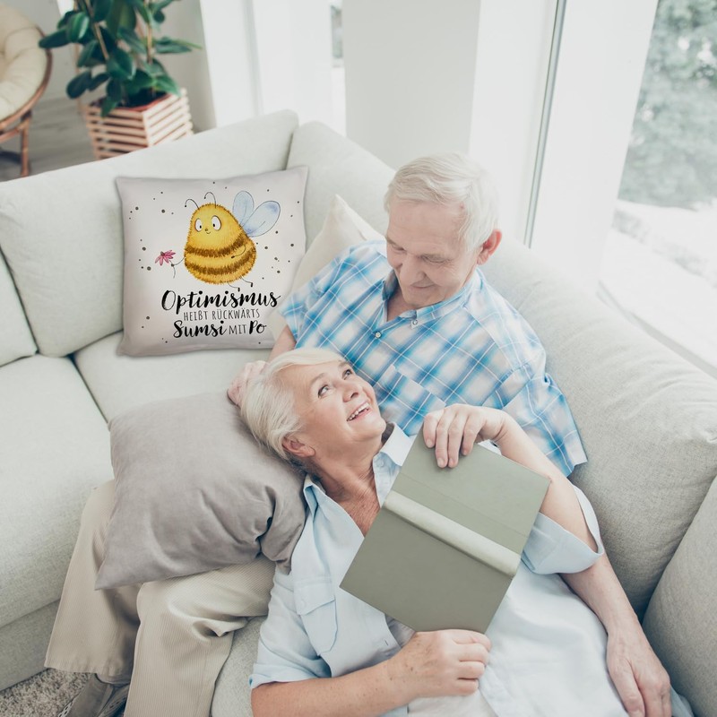 speecheese Pummel Bee Cushion with Saying "Optimismus heißt rückwärts Sumsi mit Po Ein bequemes Decorative Cushion for Sofa Women Birthday Cuddly Cushion Cover Bumblebee Printed Motif