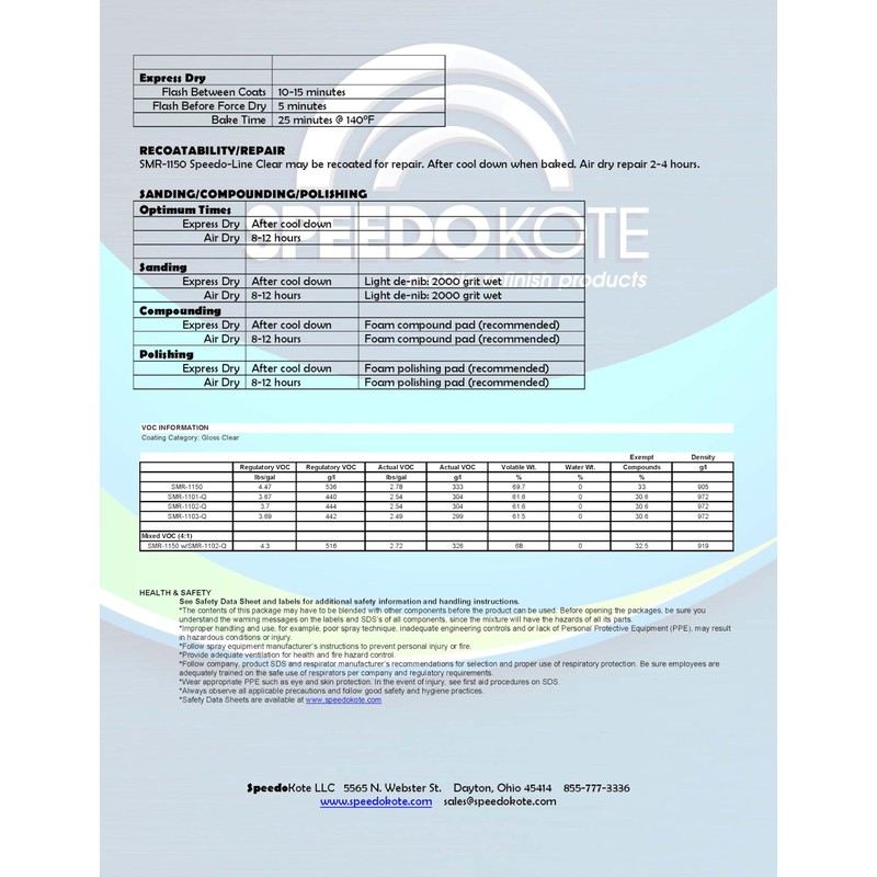 This product is not available in California, Maryland, or Delaware. Please order SS-132. Please note, If you order this product to be shipped to these states, a replacement may be used and will delay your shipping. SMR-1150 Speedo-Line Universal Clearcoat has been specifically formulated to be economical for the mobile repair industry. SMR-1150 has been designed to increase profit without sacrificing quality. SMR-1150 is a 2K acrylic urethane clear with UV and chemical resistance. Not for sale in California, Delaware or Maryland
