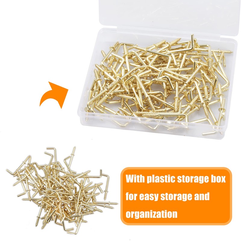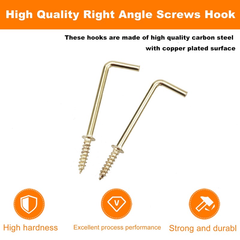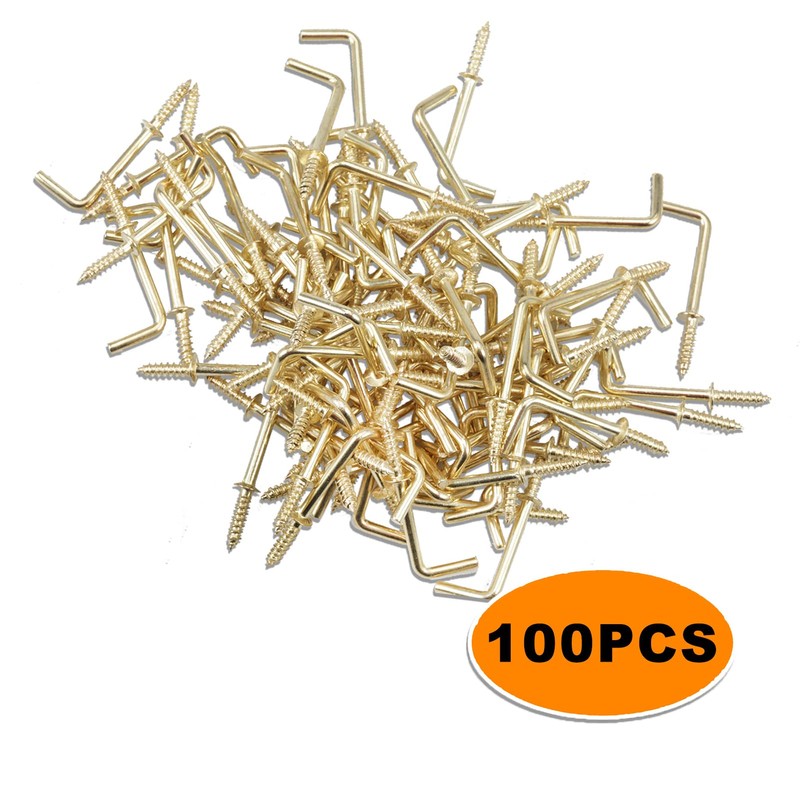 【Right Angle Screws Hook】【Specification】 Material: carbon steel; Surface: brass plated. Package Include: 100PCS 1" Right angle screws hook; 1 x storage box. Size: 38 x 13.5 x 5.8mm/1.5 x 0.5 x 0.2".【Attention】 1. Please keep out of children. 2. Please inspect before every use. Do not use if damaged.