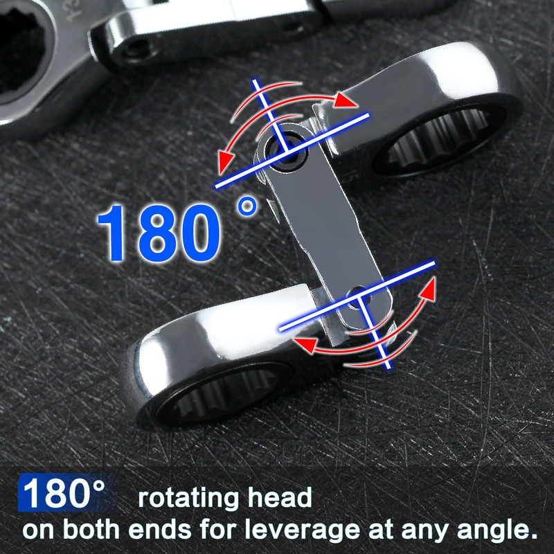 • 【DESIGN】180 degree rotating flexible heads of ratcheting wrench set allow you to apply leverage at any desired angle and get around obstructions; 72 tooth ratchet gear needs a minimum of 5 degree swing arc that is perfect for restricted, hard to reach work spaces.