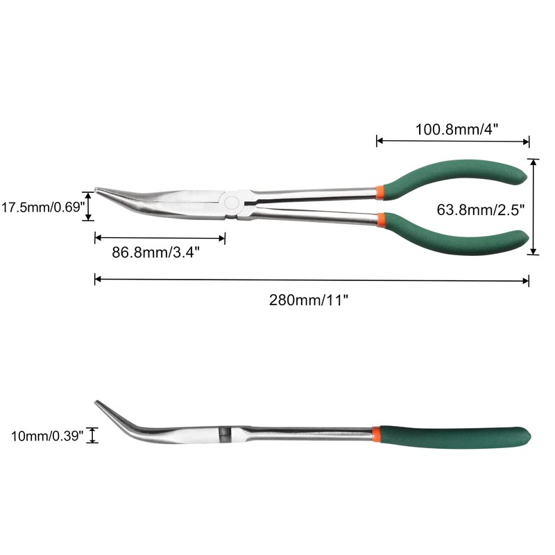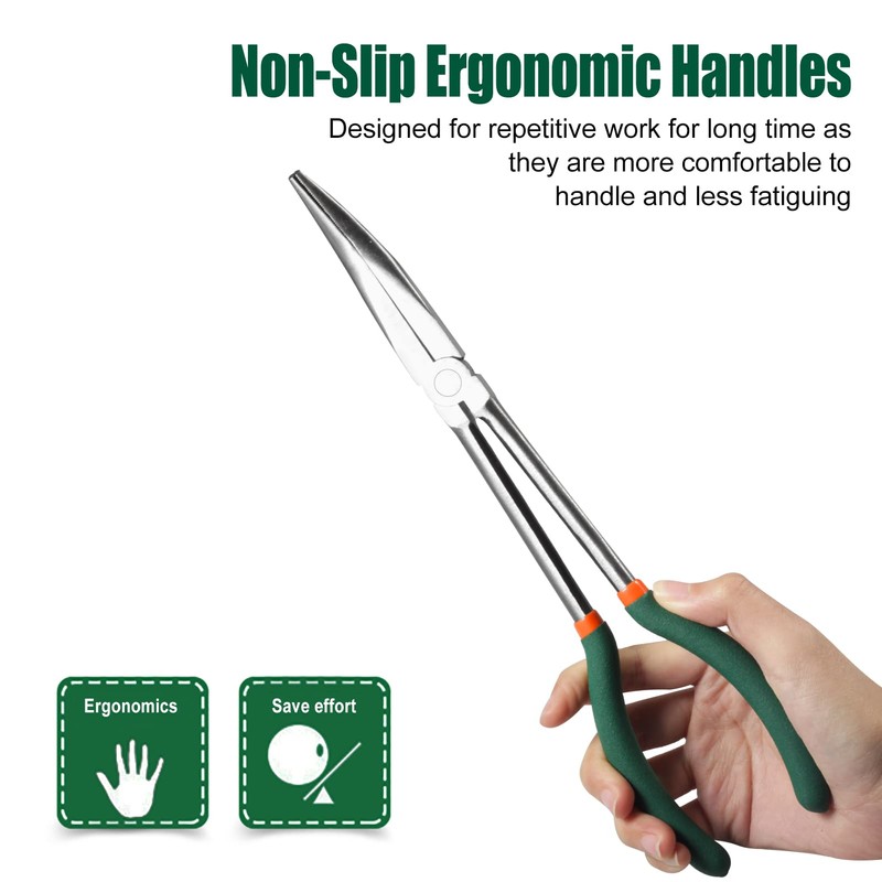 - 【USAGE】 Long-reach design combined with the compact size makes the pliers ideal for use in confined areas. Designed for working around obstructions. The 45°jaws are great for grasping and bending wires. A must-have tool for automotive work, mechanics work, art and craft, and other hobby work.