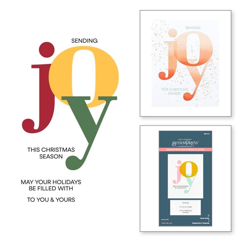- The set of seven press plates and one mylar printed registration template come together to create a multi-color and bold JOY sentiment focal point.