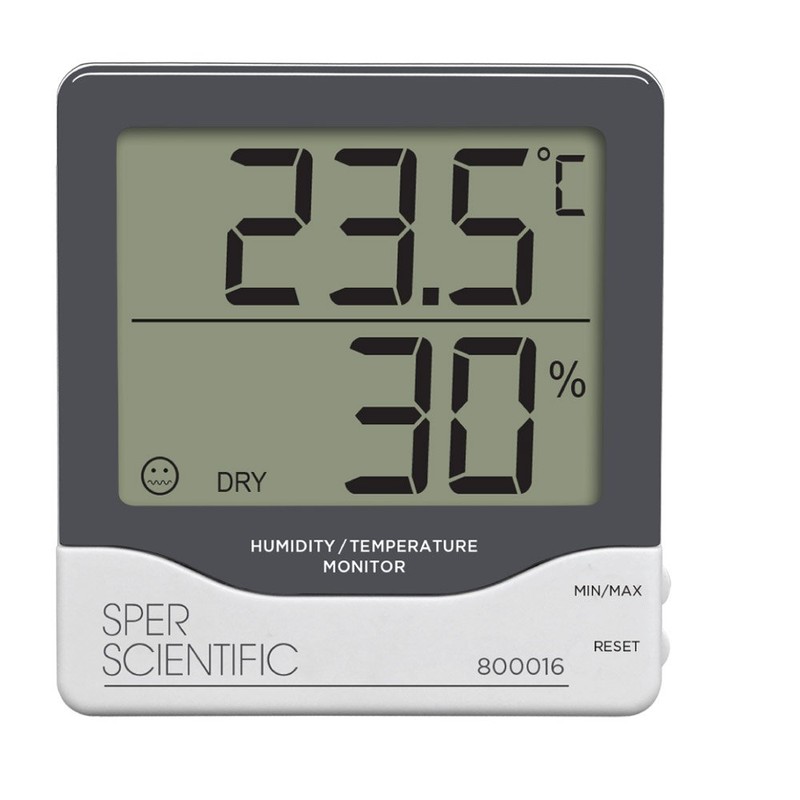 • Sper Scientific 800016 Digital Humidity Temperature Monitor - Large Display- Simultaneously monitors both temperature and humidity on an extra large 3-3/16 x 2½" dual display which can be read from across a room