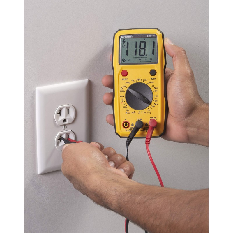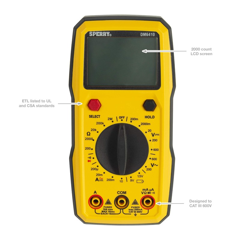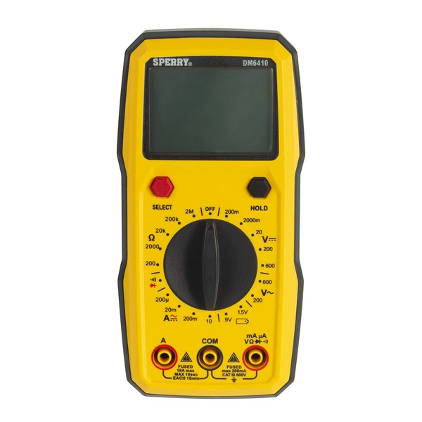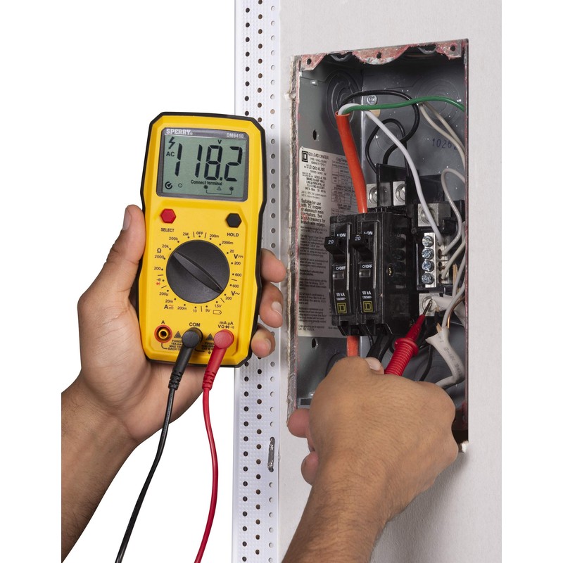 Engineered to exceed the expectations of the professional electrician, the Sperry Instruments DM6410 8 Function Manual Ranging Digital Multimeter offers a durable and ergonomic impact resistant design manufactured to the latest industry standards. Featuring improved audible and visual indicators, the industry's leading LCD display size, and easy to read markings. This unit features a data-hold switch to maintain the reading on the lCD screen (maximum count: 1999) and a low battery indicator to ensure you won't get incorrect readings due to low batteries. This unit uses two AAA batteries and includes an auto-off function designed to save battery life. Special test lead input icons integrated into the display prompt the user to ensure correct lead placement for a desired test. Capable of testing AC/DC voltage and current this meter also measures amps, resistance and continuity (audible), and performs diode and battery testing (1. 5V, 9V). Data hold feature captures reading on the display and holds thru multiple tests. Housing is impact resistant. CAT III (660V), cETLus and CE rated with a lifetime to give our users the peace of mind they deserve. Ships with two AAA batteries included in the package.