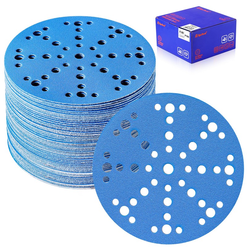 SpeTool 6 Inch Sanding Discs, 49 Hole Hook and Loop Sandpaper 60 Pack Compatible for Random Orbital Sander, Stearate Anti-Clog Coating with 180 Grit Ceramic Aluminum Oxide Abrasives for Sanding Chore