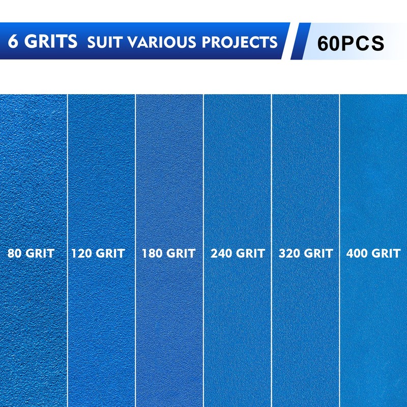 - Different Grits Application: 80 grit, coarse for remove shallow scratches, 120 grit, medium for starting grit for softwoods, 180 grit, medium for surface irregularities, 240 grit, fine for begin surface finishing, 320 grit, finer for sanding between coats, 400 grit, extra-fine for final surface finishing grit