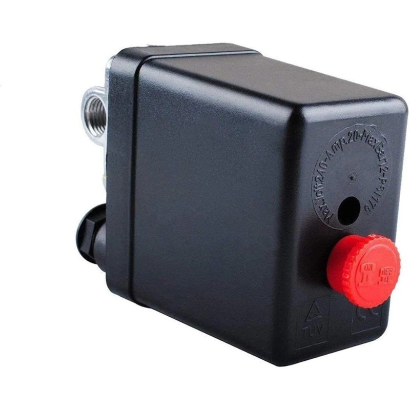 This is a great switch for miniative air compressor It can help to save electric energy of the air compressor Easy to install and convenient to use There is a red ON/OFF switch knob Auto control,Auto load/unload Four female air inlet ports with approx. 0.4 inch / 11 mm thread diameter Maximum Voltage: 240V Current: 16A Maximum Pressure: 90-120 PSI Casing Dimension(L x W x H): Approx. 82 x 82 x 52mm(3.2 x 3.2 x 2 inches) Color: Black Package includes: 1x air compressor switch control