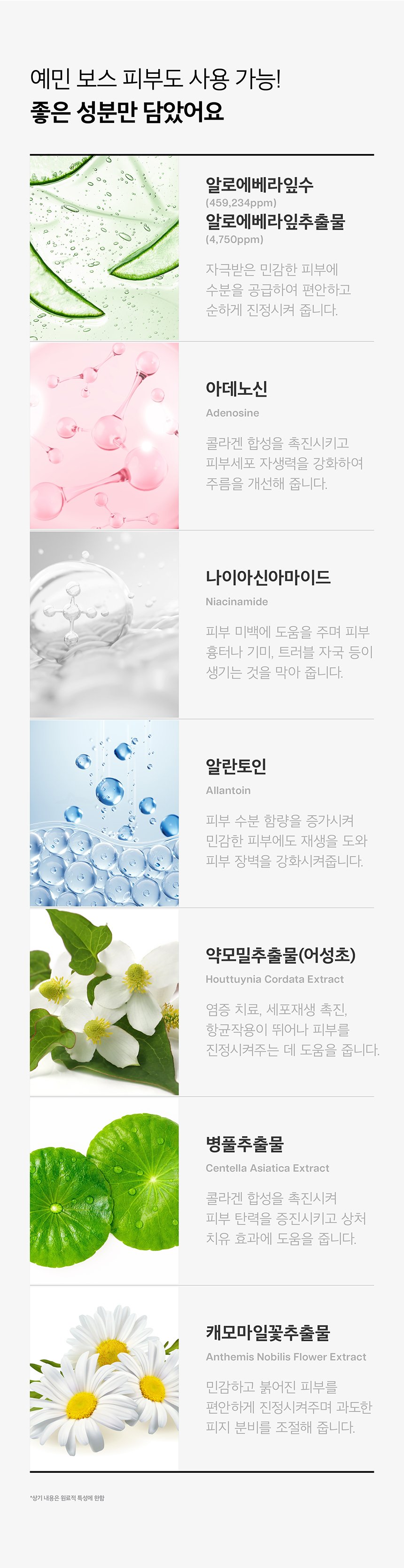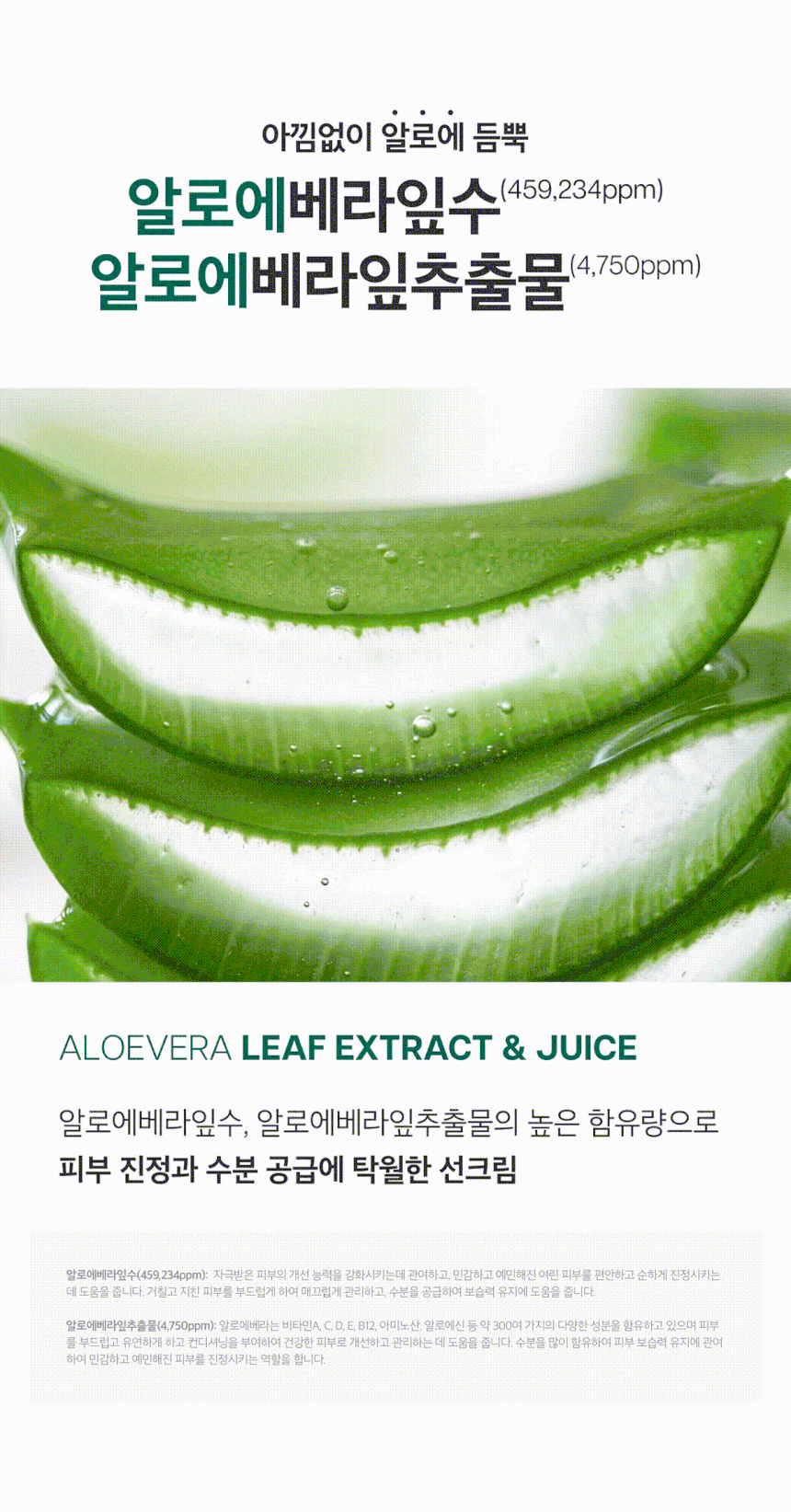 - all_ingredients_required_by_cosmetics_law: Aloe Vera Leaf Extract (459,234ppm), Ethylhexyl Methoxycinnamate, Butylene Glycol, Glycerin, Purified Water, Titanium Dioxide, Ethylhexyl Salicylate, Cetyl Ethylhexanoate, Bis-Ethylhexyl Hydroxyphenyl Methoxyphenyl Triazine, Glyceryl Stearate SE, Phenyl Trimethicone, Niacinamide, Dimethicone, 1,2-Hexanediol, Sodium Acrylate/Sodium Acryloyldimethyl Taurate Copolymer, Polysorbate 60, Isohexadecane, Aloe Vera Leaf Extract (4,750ppm), Cetearyl Olivate, Aluminum Hydroxide, Oles-10, Stearic Acid, Sorbitan Olivate, Phenoxyethanol, Chlorphenesin, Polysorbate 80, Grapeseed Oil, Sorbitan Oleate, Allantoin, Fragrance, Adenosine, Houttuynia Cordata Extract, Maltodextrin, Triethoxycaprylylsilane, Disodium EDTA, Betaine, Trehalose, Panthenol, Chamomile Flower Extract, Centella Asiatica Extract, Apple Extract, Kiwi Extract, Lemon Extract, Grapefruit Extract, Yuzu Extract, Pomegranate Extract, Orange Extract, Grape Extract, Limonene, Linalool