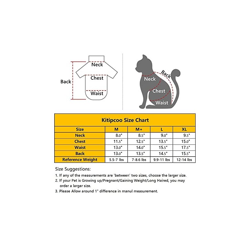 - 【Measures】Attention: All these Size suggestions are for Hairless Cat Only. Size S for Weight under 5lbs. Size M for 5.5-7 lbs. Size M+ for 7-8.6 lbs. Size L for 8.8-12 lbs. If Your cats are NOT hairless but like our shirts, Please order one size Larger. More Size information please refer to the size chart below.