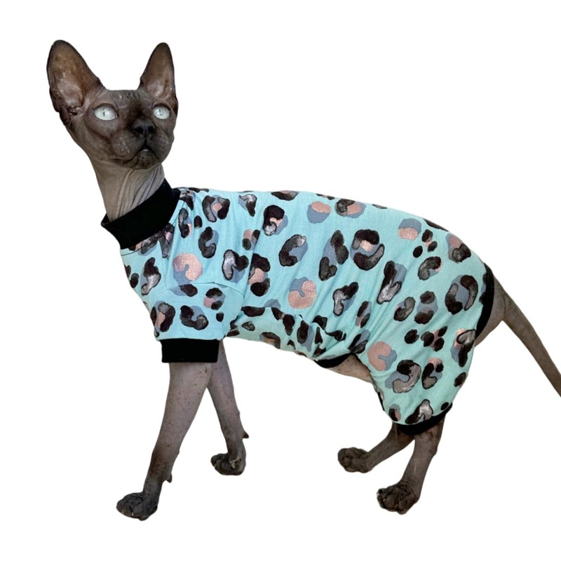 Sphynx Cat Four Leg Cotton Pajamas Elastic Pet Clothes for Hairless Cats Surgery Recovery Suit Undershirt Thermal Clothes for Sphynx, Devon, Cornish (Mint Leopard, M)