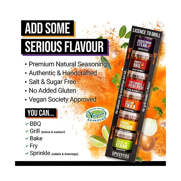 - LICENCE TO GRILL - THE ULTIMATE MULTI USE GOURMET SEASONING BLEND & SPICE SELECTION - 100% pure, clean, natural spice seasoning - enjoy six pots of delicious seasonings and rubs from around the world. They're perfect for indoor and outdoor grilling, for pan frying, oven and baking - as well as for general home cooking.