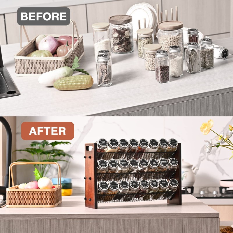 - Upgraded Seasoning Organizer Design: The spice rack organizer for cabinet adopts an inclined design, with labels attached to the spice jars lid, allowing you to find the seasoning you need at a glance. The 3 tier spice rack can hold 24 4-ounce jars, effectively increasing the usable kitchen countertop or cabinet space, adding a stylish and rustic look while keeping the room tidy. The handle design makes it easy to carry to the barbecue.