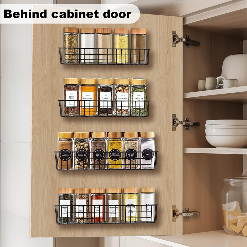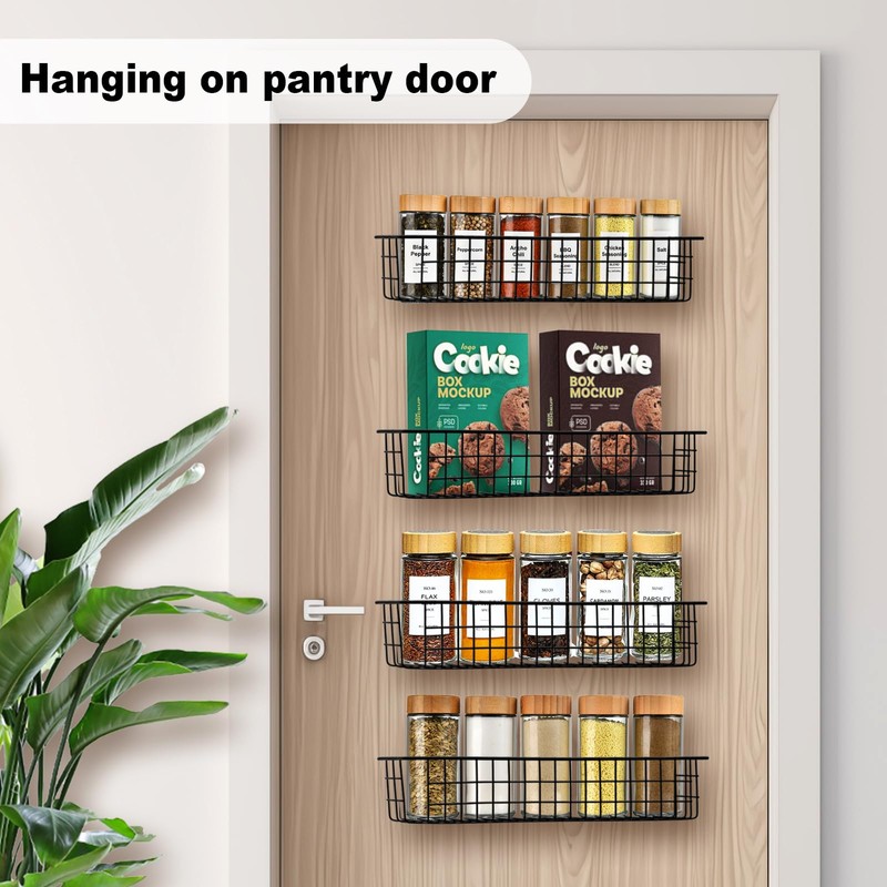 Spice Rack Organizer Wall Mount, 4 Pack Black Seasoning Rack Wire Storage Baskets for Wall or Cabinet Door in Kitchen and RV