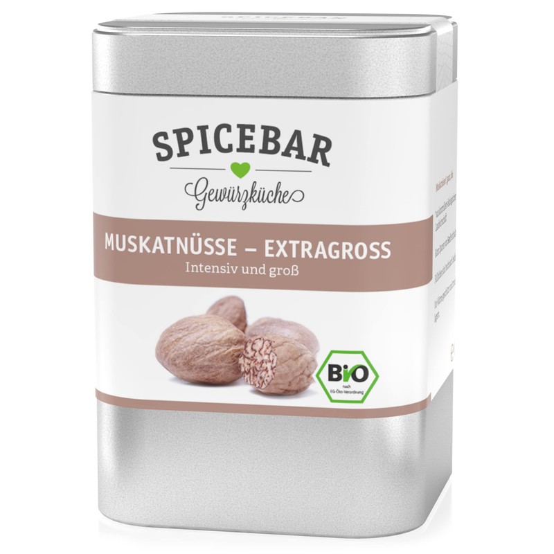 Spicebar Organic Nutmeg Whole (60 g) - 9-12 Extra Large Organic Nutmegs from India - Hand-Picked Nutmeg in Protective Aroma Tin