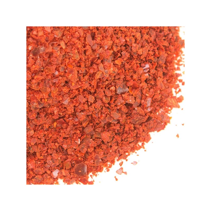 Gochugaru flakes are Korean red chili peppers that are dried in the sun. The dried peppers are then chopped to a size between flakes and powder. It’s often seen at Korean restaurants and is used as a condiment for nearly every food. Use Korean red chili peppers for homemade kimchi, or for flavoring tofu and eggs. Gochugaru flakes are both fruity and smoky, with a distinct medium heat.