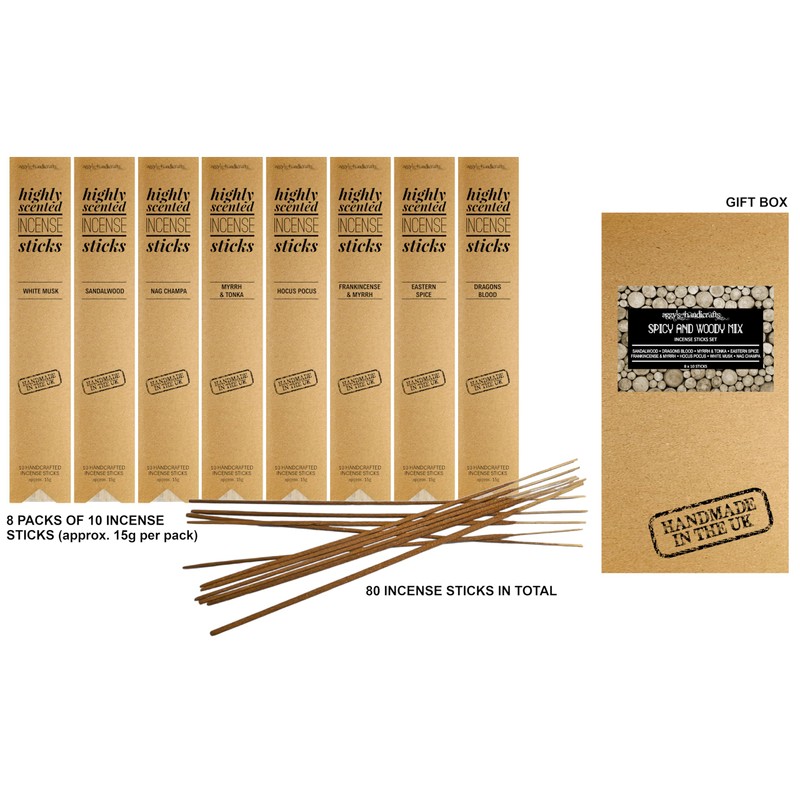 SPICY & WOODY MIX Incense Sticks Set, 8 Scents, 10 Sticks of Each Scent (approx. 15g), 80-100 Minutes Burning Time per Stick, Handmade in the UK, Highly Scented (80 Sticks)
