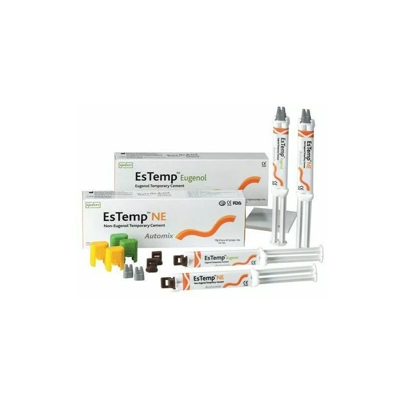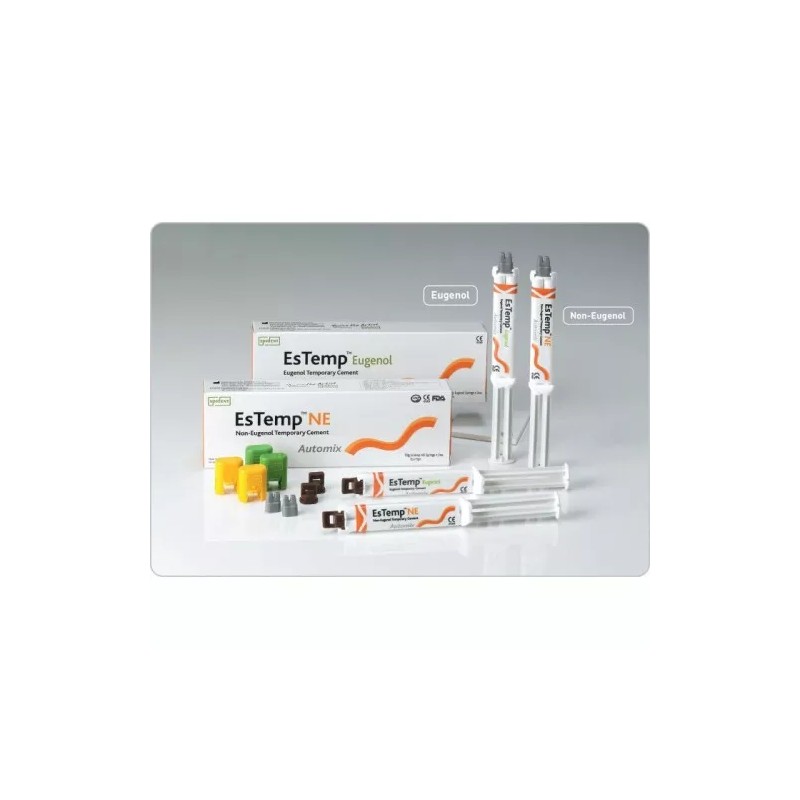 - EsTemp temporary cement product series consists of EsTemp & EsTemp NE (Non-Eugenol). Each is designed to be suitable for various applications such as temporary crowns and bridges or trial cementation for permanent restoration. EsTemp is zinc oxide eugenol temporary cement and EsTemp NE is zinc oxide non-eugenol temporary cement.
