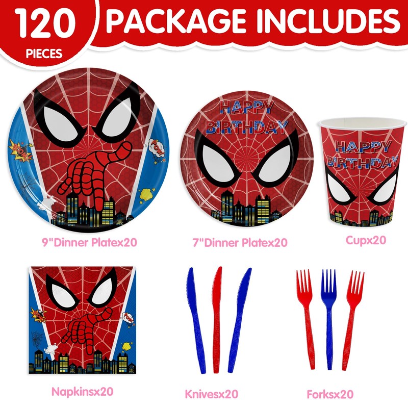 - Birthday Party Supplies:This hero birthday party supplies includes: 20 x 9" plates, 20 x 7" plates, 20 x cups, 20 x napkins, 20 x forks, 20 x Knife. There are a total of 120 pieces in this superhero birthday tableware set, which can easily host a birthday party of up to 20 guests