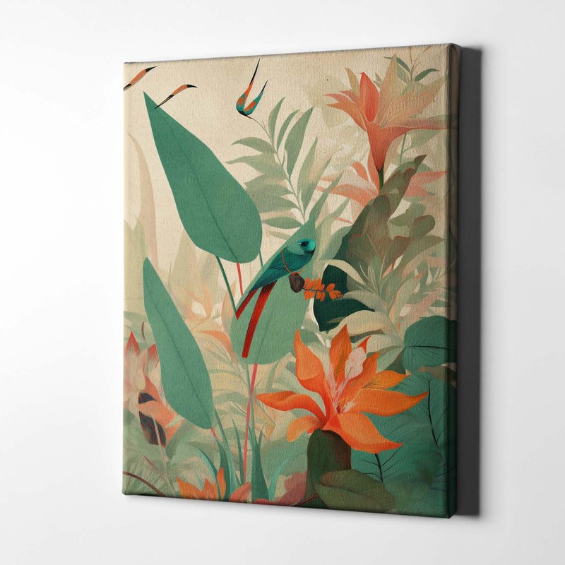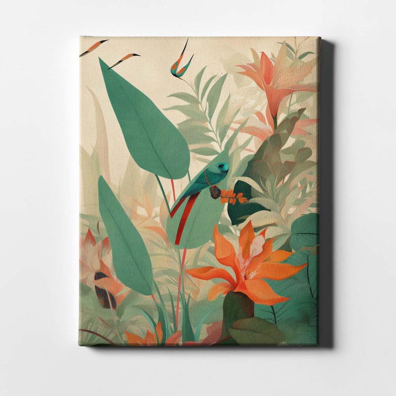 Spiffing Prints Jungle Bloom I – Tropical Bird and Botanical Flower Print in Soft Colours - Medium - Unframed