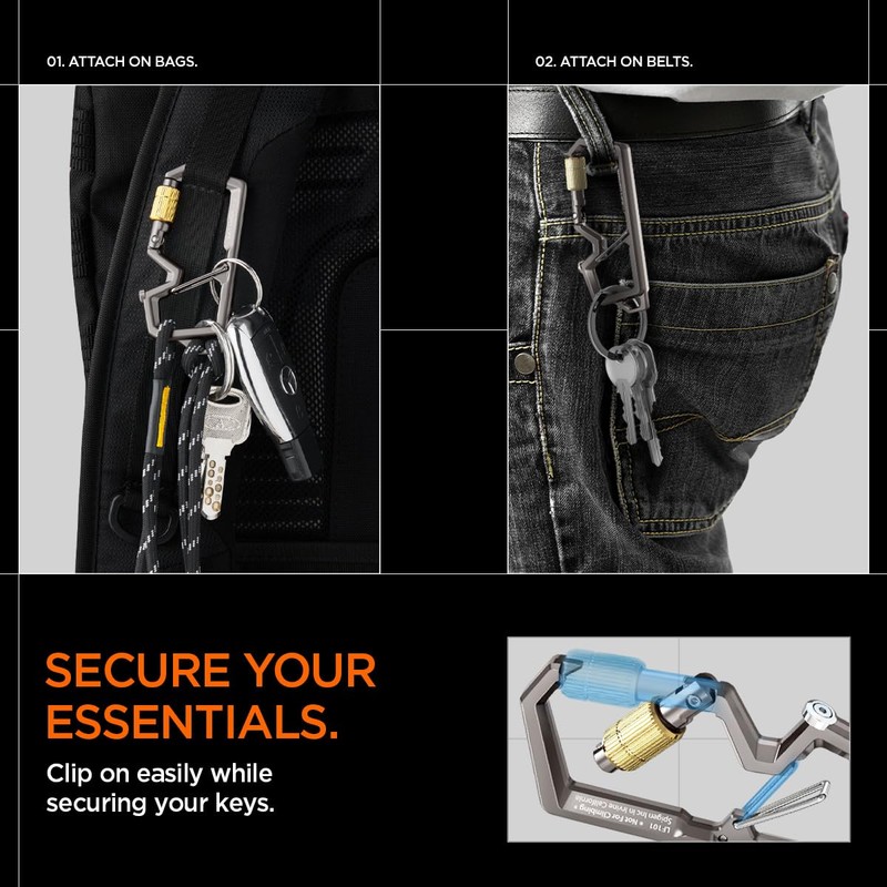- Secure Lock: Twist-to-lock design secures items on carabiner when clipped onto your belt loop or backpack