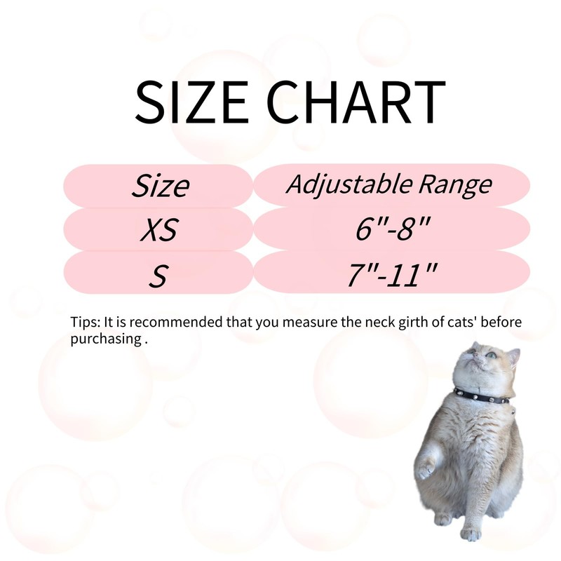- SIZE ADJUSTABLE - First of all, it is recommended that you measure the neck girth of cats' before purchasing. Size XS is best for cats whose neck girth is among 6 inches to 8 inches, and size S is for cats whose neck girth among 7 inches to 11 inches