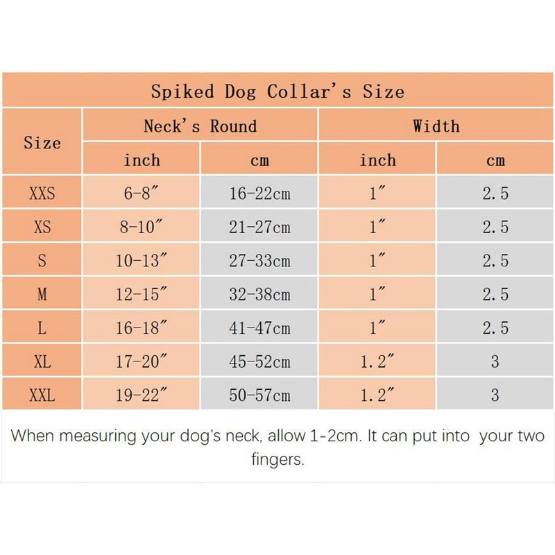 Spiked Collar For XXS XS Small Medium Large Dogs-- We provide multiple colors and sizes to fit to different sizes pets, from puppies cats to large dogs. Such as Chihuahua, shih tzu, poodle, pug, Pitbull, husky, Shiba, Boston terrier, French bulldogs etc.