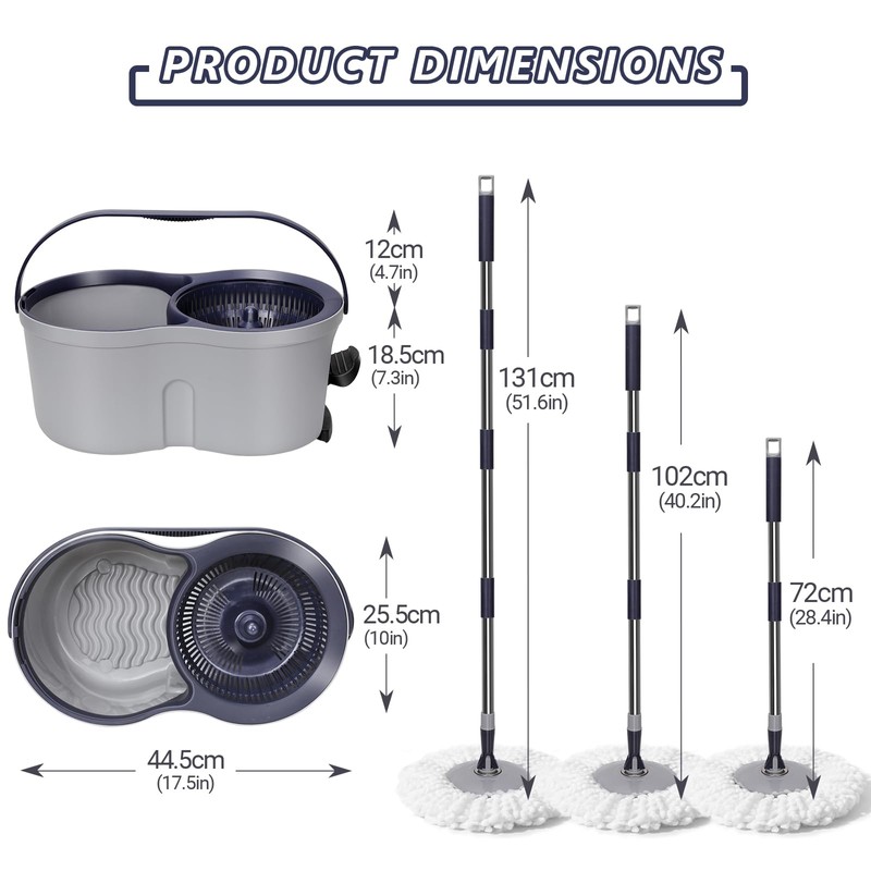 - 360° Rotating Mop: The flexible mop head can be rotated 360° at will. Makes it easier for you to clean corners when cleaning. Whether it is under the sofa, under the coffee table, or the skirting of the wall can be cleaned.Our spin mop and bucket comes with 3 microfiber spin mop pads, machine washable and easy to replace.