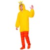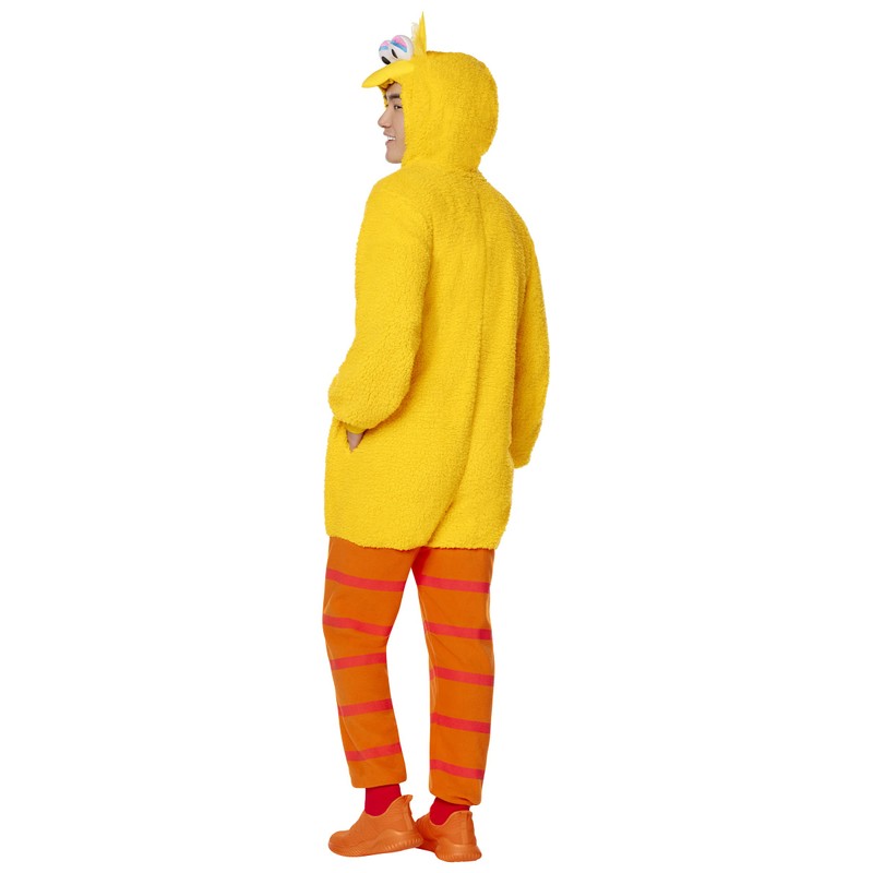 This zip-up costume features Big Bird's signature yellow body and orange legs. With a delightfully fuzzy bodice, this Big Bird costume is soft to the touch. An attached hood features Big Bird's familiar eyes and beak. When you wear this Big Bird costume, it's sure to be a sunny day.