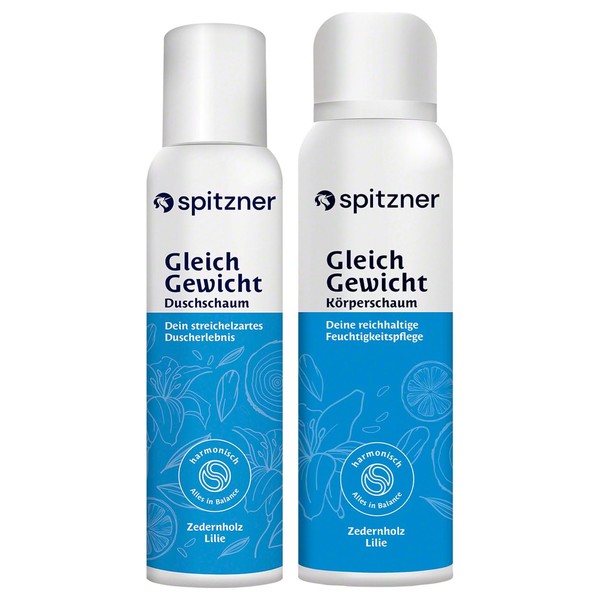 Die tägliche Körperpflege ist mehr als nur eine lästige Notwendigkeit. Sie ist ein Moment der Selbstfürsorge, eine Auszeit vom Alltag und ein Verwöhnmoment für Körper und Geist. Sorgfältig aufeinander abgestimmte Pflegeprodukte versorgen unsere Haut mit allem, was sie braucht und sorgen für ein rundum gepflegtes und entspanntes Hautgefühl. Das zweiteilige Set aus Dusch- und Körperschaum GleichGewicht macht die tägliche Körperpflege zu einem besonderen Wohlfühlerlebnis. Der Duschschaum sorgt für sanfte Reinigung, während der Körperschaum Ihre Haut intensiv mit Feuchtigkeit versorgt. Gleichzeitig verwöhnt das Set Ihre Sinne mit einem exotisch-holzigen, fruchtigen Duft nach Zedern- und Sandelholz, kombiniert mit Lilie, Jasmin und fruchtiger Orange. Die sanften Texturen der beiden Produkte sind besonders hautfreundlich und 100% vegan, der reichhaltige Körperschaum zieht zudem schnell ein, ohne ein klebriges Gefühl zu hinterlassen. Beide Produkte sind frei von Parabenen, Silikonen, PEG und Mineralölen. Zudem enthalten sie weder Alkohol noch Farb- und Konservierungsstoffe und kein Mikroplastik. Dank ihrer milden Rezepturen wurden die Schäume nach dermatologischen Tests mit der Note sehr gut ausgezeichnet. Die Anwendung Ihrer Pflegeprodukte ist denkbar einfach: Schütteln Sie den Duschschaum vor Gebrauch und sprühen ihn anschließend auf Ihre feuchten Hände. Verteilen Sie ihn wie gewohnt auf Ihrem Körper und spülen ihn anschließend gründlich ab. Bei der Verwendung einer walnuss- bis faustgroßen Menge Schaum pro Duschgang ist die 150 ml Dose ausreichend für ca. 60 Duschgänge und somit sehr ergiebig. Tragen Sie den Körperschaum nach dem Duschen auf die feuchte Haut auf und massieren ihn sanft ein. So wird Ihre Haut optimal mit Feuchtigkeit versorgt und fühlt sich langanhaltend gepflegt und zart an. Dank des handlichen, auslaufsicheren Designs eignet sich das Set auch bestens für unterwegs. Erleben Sie sanfte Reinigung und intensive Pflege - mit dem Spitzner Körperpflege-Set Gl
