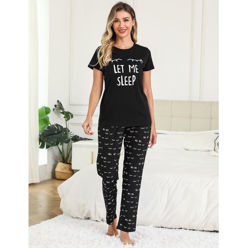 SPKPKEY Women‘s Cotton Pajamas Set Short Sleeve Cute Printed Tops and Long Pants 2 Piece Loungewear Sleepwear PJs Sets Black Small