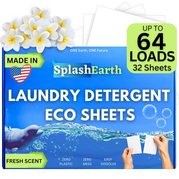 Splash Earth Laundry Detergent Sheets Made in USA (64 Loads, Fresh Scent), Eco-Friendly Washer Sheets Detergent, Plastic-Free Travel Laundry Soap, 32 Strips