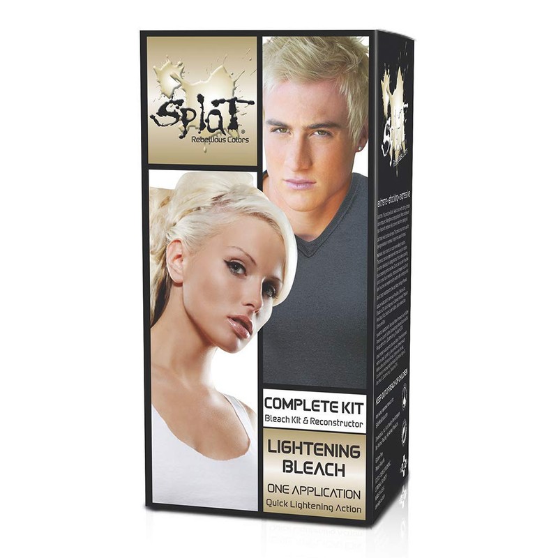 Splat Hair Color Complete Kit, Lightening Bleach, Extreme, shocking, expressive, long lasting, semi-permanent hair paint. Splat hair color complete kit lightening bleach includes. Splat lightening bleach.Splat oxide mixing container. Long lasting hair color. Gloves and instructions.