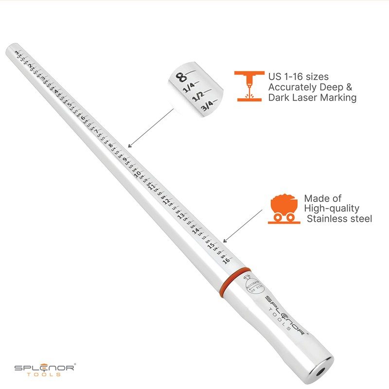Splenor Tools 13" Solid Stainless Steel Un-grooved Ring Mandrel - for Measuring & Forming Rings - Jewelry Making Tool - Ring Sizer - Size (US 1-16)