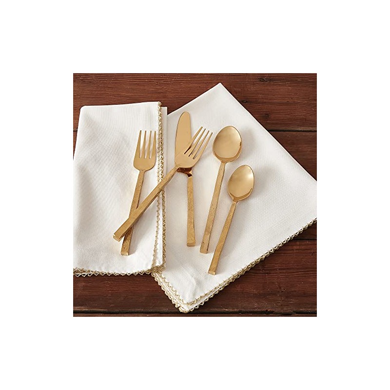 - The Avis Gold Flatware is trendy with a gold finish, stainless steel, squared-off handle with unique shaping that gives it a hand-made look with mechanized dependability